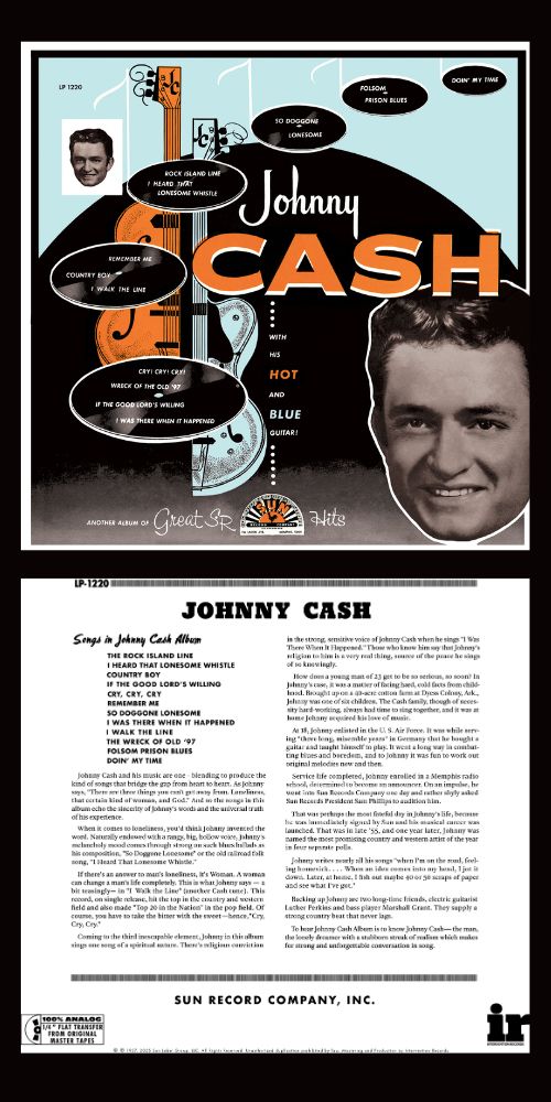Originally issued in the fall of 1957—the first long-player for Sam Phillips’ Sun Records—Johnny Cash with His Hot and Blue Guitar! showcases the stripped-down sound that would make the future Man in Black one of the most enduring and respected musicians of the 20th century. Backed only by his “Tennessee Two” (Luther Perkins on lead guitar and Marshall Grant on upright bass) and augmented by Phillips’ signature studio slapback that gave Cash’s “boom-chicka-boom” sound its kick, Hot and Blue Guitar! is the album that introduced many to Cash’s sonorous baritone.