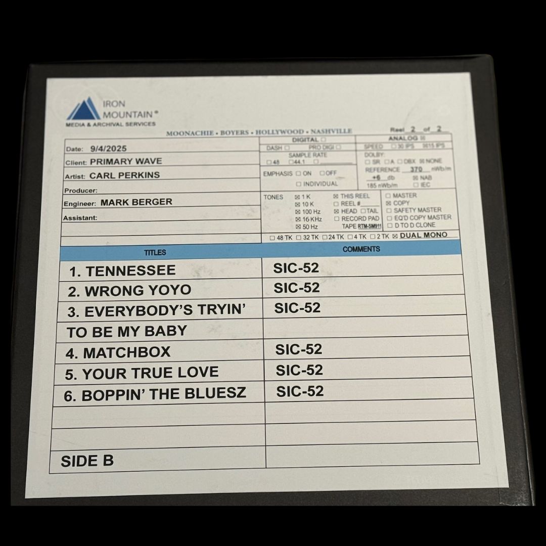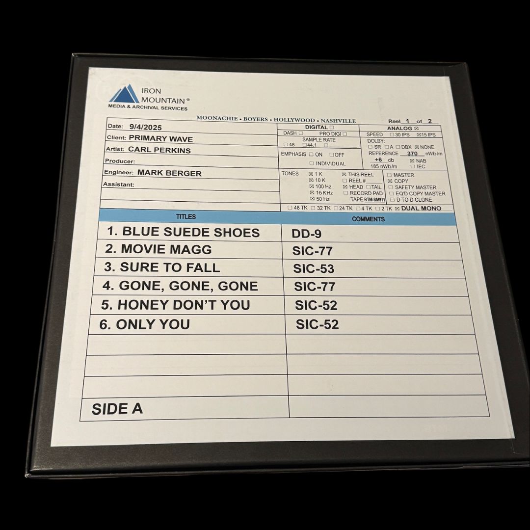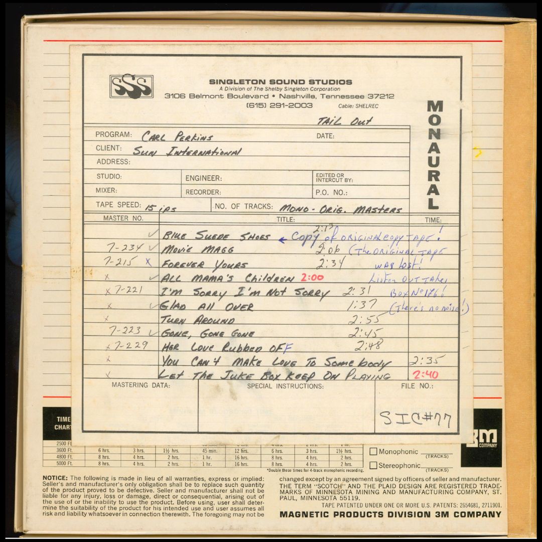 Intervention worked closely with Sun Records and the Archive Team at Iron Mountain to compile a completely NEW set of A/B reel master tapes for this release. In the late 1960s, when Shelby Singleton purchased Sun Records from legendary Sam Phillips, the original 7" single master tape reels were compiled onto many different sets of 1/4" tapes. Identifying any one tape as "THE master" for a given song is no longer possible, but hours and hours were spent by Sun and IR's Shane Buettner listening to tapes and identifying the absolute best sounding tape version of each and every song. Kelly Pribble, Mark Berger, and Scott Delaney at Iron Mountain made flat 1/4" transfers at our direction to a newly minted set of 1/4" A/B reels for this release.